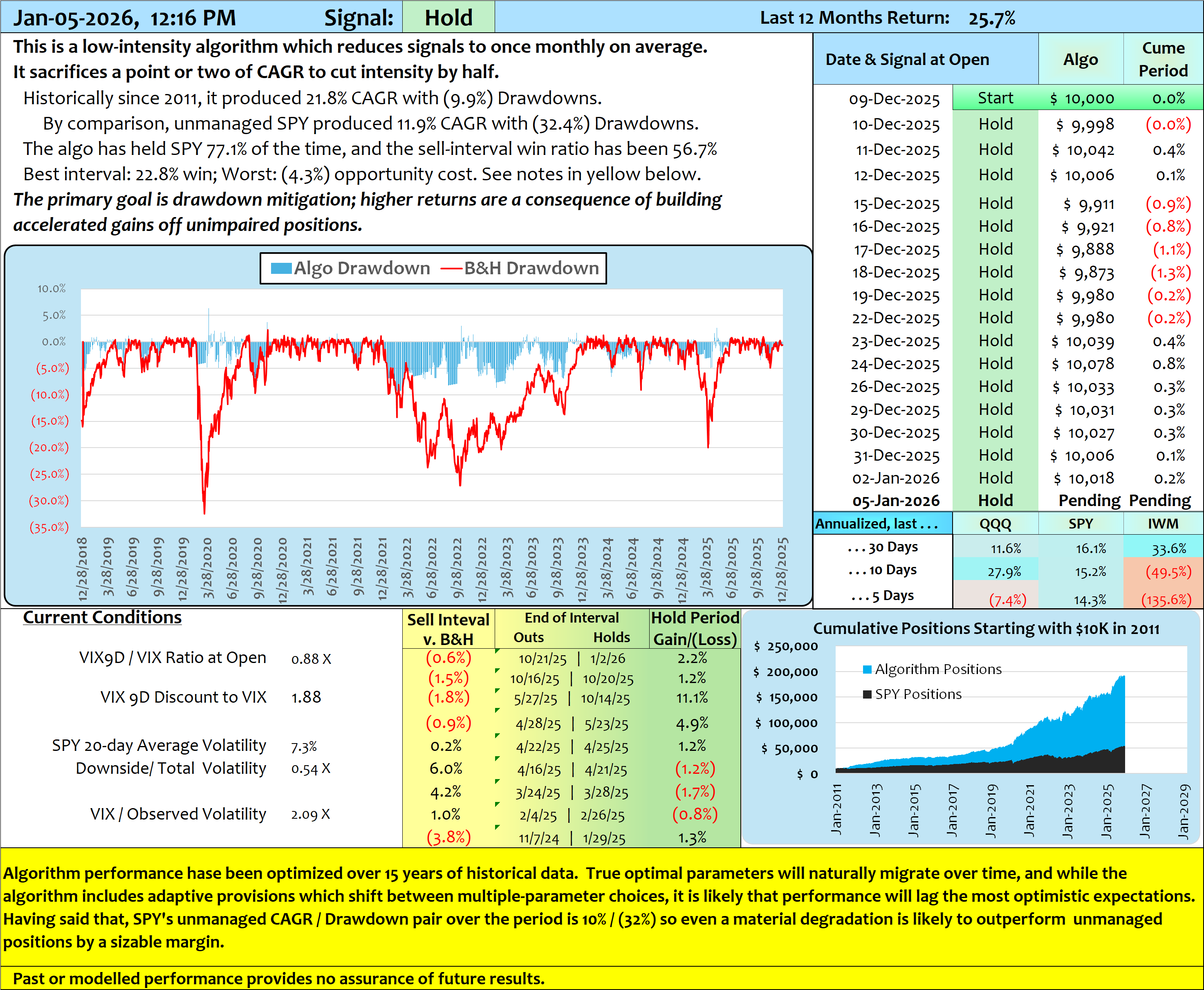 The Risk Signature Algorithm produces low-frequency signals, about one per month, an improvement on the number of false signals of legacy models. As modelled, the worst drawdown since 2011 indicated (9.9%) compared to (32%) for unmanaged SPY. By avoiding the worst downturns, the algorithm was able to produce 22% compound annual growth since 2011 and 27% in 2025.